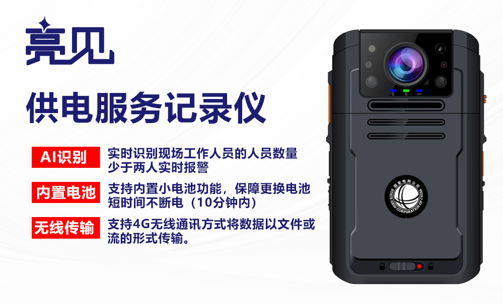 亮见供电服务记录仪具有机身小巧、易于携带、操作简便、智能回传等特点,可长时间续航,适用于各类作业现场,通过4G无线网络实现作业现场音视频信号的实时回传;监控终端具备画面实时调阅、远程呼叫、图像抓拍、视频录像等功能,可在计算机、平板电脑安装查看。